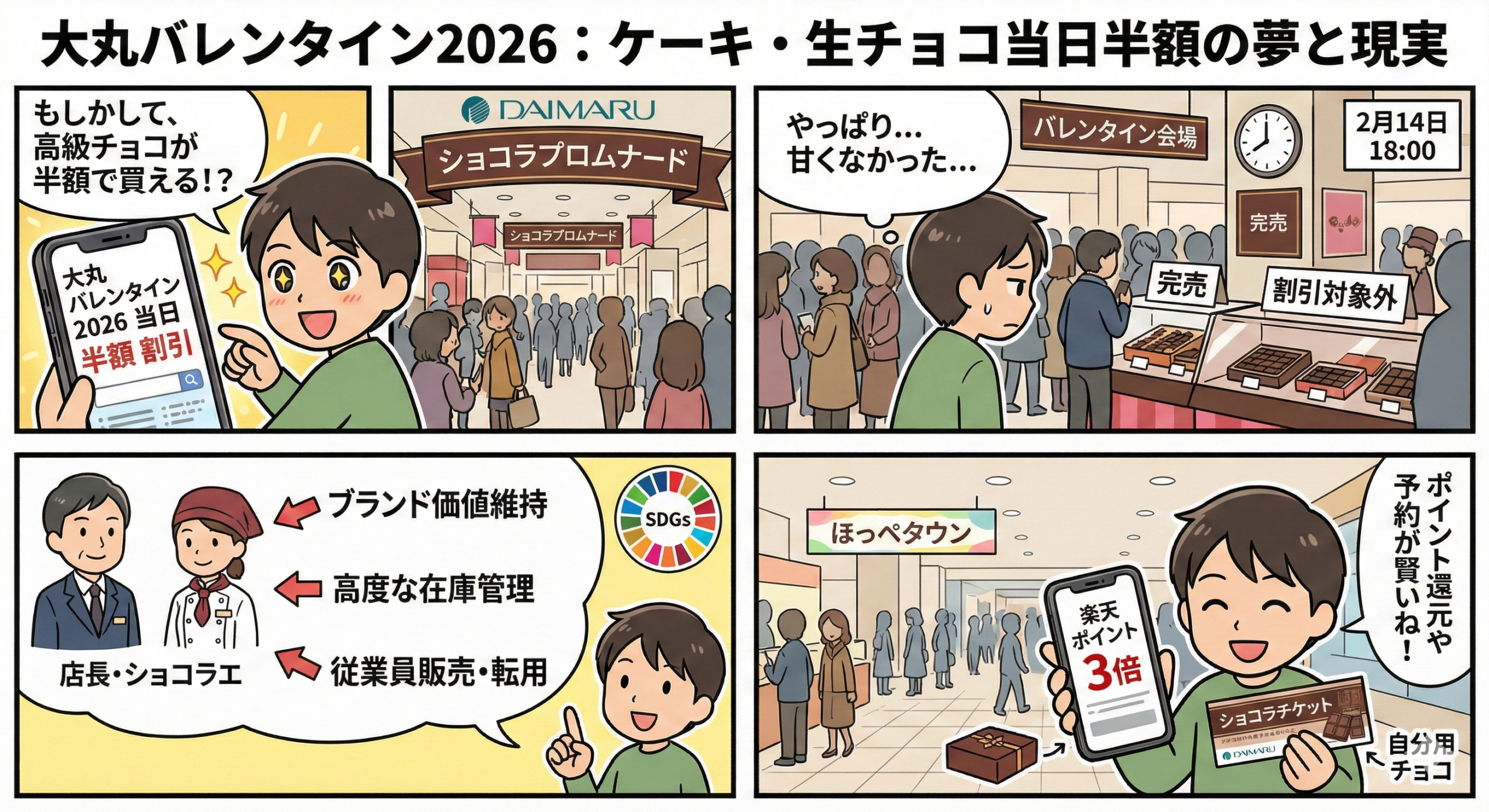 2026年のバレンタイン商戦において、誰もが一度は夢見る「当日夕方の半額セール」。特に大丸のような一流百貨店で、普段は手が出ないような高級ブランドが値引きされていたら最高ですよね。しかし、私たちが期待するような店頭での「半額シール」は、実はほとんど存在しないというのがこの業界の定説です。なぜそのような状況になっているのか、そして2026年ならではの店舗ごとの動きはどうなっているのか、まずは全体像から整理していきましょう。