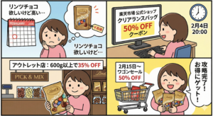 コーヒー豆が半額になる時期にバレンタインチョコを買うと、コーヒー豆の割引分で浮いたお金で、もう一つチョコが買えてしまう計算になります。