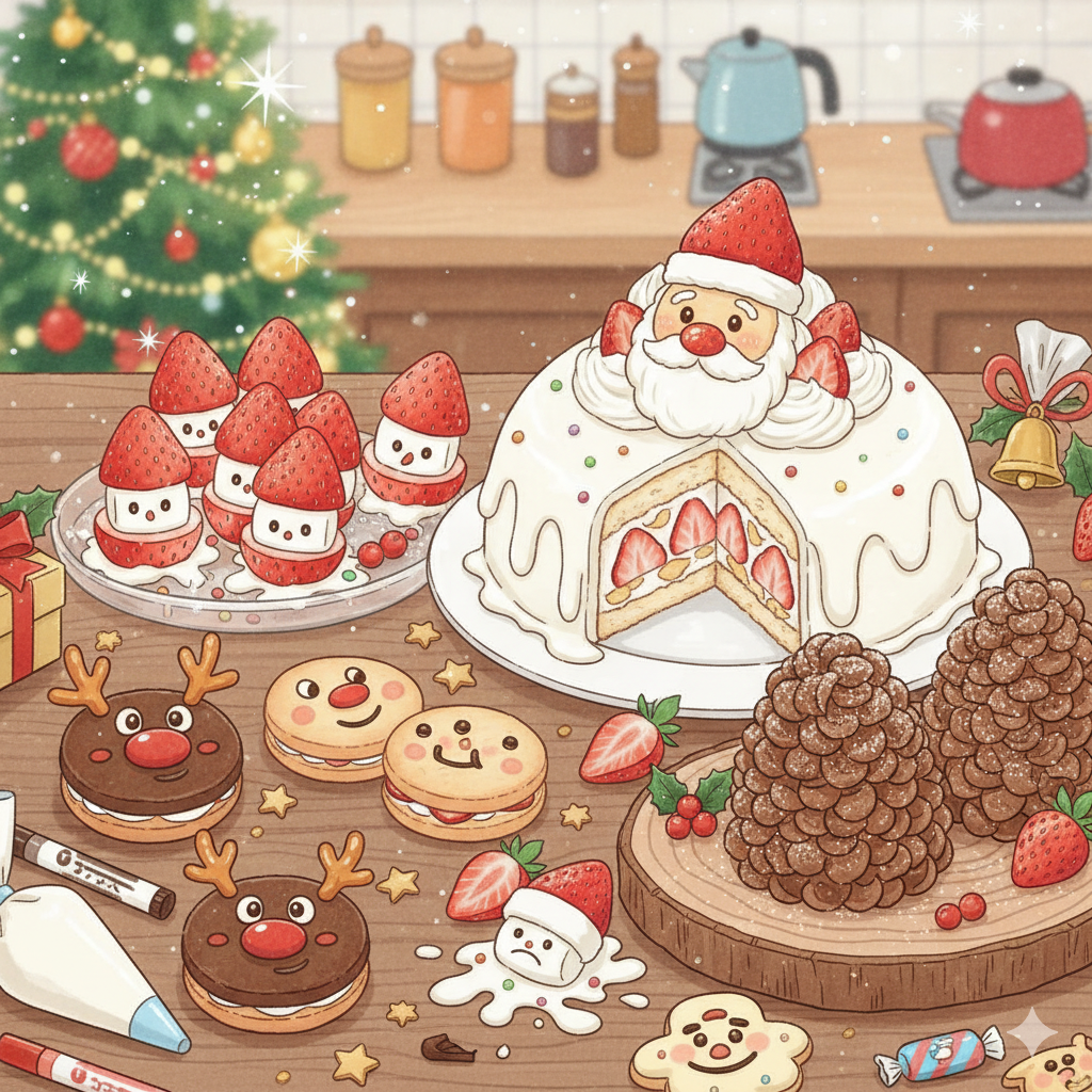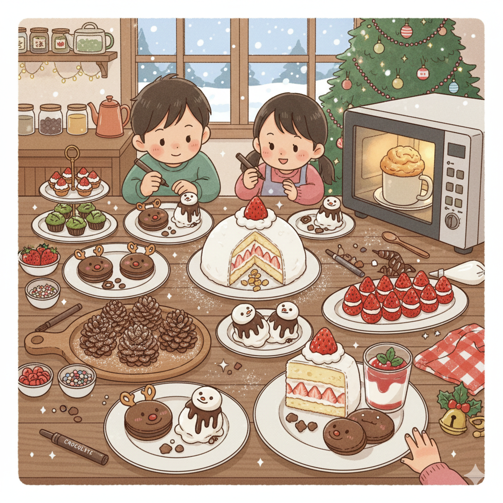 この記事では、ホットケーキミックスを使った電子レンジでできる簡単レシピから、火を一切使わずに市販品をデコレーションするだけのアイデアまで、子どもと一緒に「簡単」に「楽しく」作れるクリスマスデザートの作り方を、私の経験も交えてたっぷり紹介しますね。完璧さよりも、親子の「楽しい時間」を最優先にいきましょう!