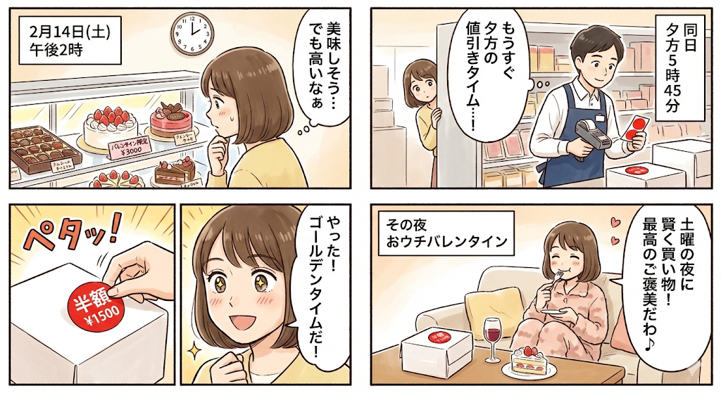 バレンタイン限定の「ケーキ」ほど、当日割引が期待できるカテゴリーはありません。なぜなら、生ケーキは製造から24時間から48時間以内が美味しく食べられる限界であり、2月14日の夜を過ぎた瞬間に、バレンタインという付加価値が消失してしまうからです。2月15日に「バレンタイン限定」と書かれたハート型のケーキを定価で買う人は、残念ながらほとんどいません。店舗側としても、丹精込めて作られたケーキを廃棄すること(フードロス)は最大の痛手です。
