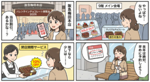 百貨店の地下食料品売り場であれば、閉店間際に値引きシールが貼られることがありますが、催事場のバレンタインイベントは全く別物です。日本橋三越や銀座三越の最終日が午後6時に設定されているのは、「場所の入れ替え」という物理的な制約があるからです。2月15日からは、すでに別の春の催事や物産展の準備が始まっています。催事場は1分1秒を争うスケジュールで運営されているため、最終日の夕方にのんびり割引販売をして在庫を調整する余裕など、現場にはありません。