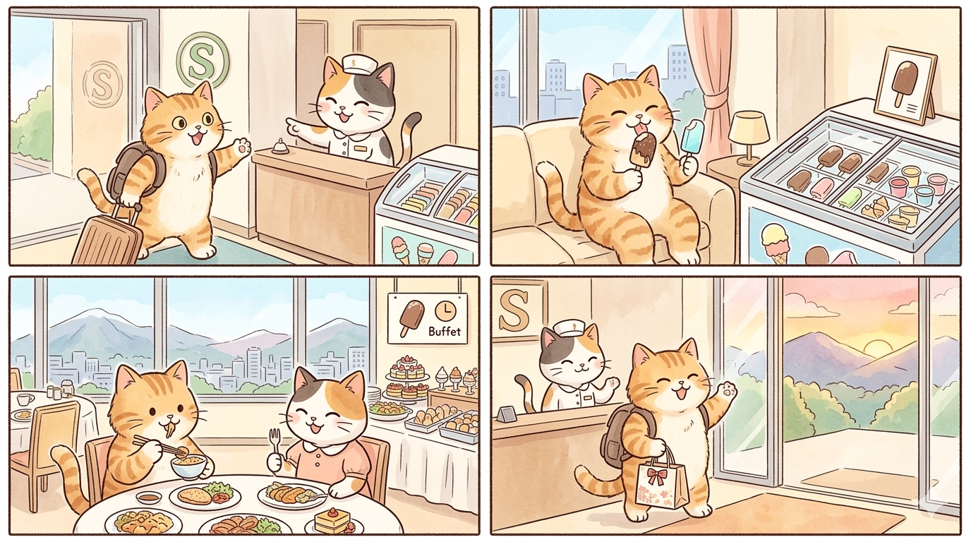 意外なことに、この24時間サービスを重宝しているのは観光客だけではありません。夜遅くまでお仕事を終えて戻ってきたビジネスマンの方が、深夜の静かなロビーで一つ、アイスを手に取って部屋へ戻る姿もよく見かけます。疲れた脳にシャトレーゼの甘さが染み渡る瞬間は、まさに至福。こうした配慮が、多様なゲストに愛される理由なのかなと感じます。