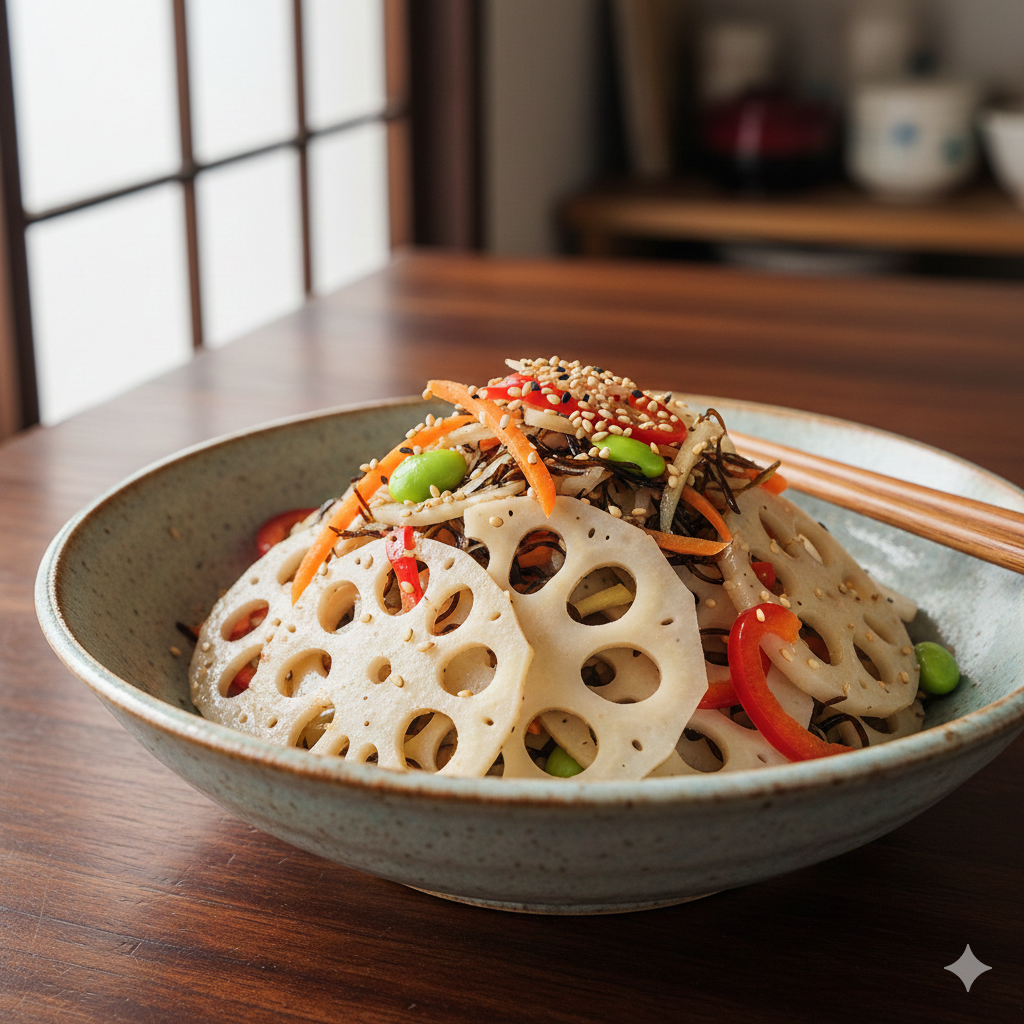 さらに、れんこんやひじきは「噛み応え」がある食材の代表格です。柔らかい葉物野菜だけのサラダとは異なり、しっかりと咀嚼(そしゃく)をする必要があるため、自然と食べるのに時間がかかります。これにより満腹中枢が刺激され、少ない量でも「食べた!」という満足感が得られやすくなります。早食いを防ぎ、血糖値の急上昇を抑えるという意味でも、ダイエット中の強い味方になってくれます。