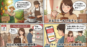 2026年バレンタインの最大の特徴、それは2月14日が土曜日であることです。これにより、例年とは異なる消費行動が生まれます。 多くの人が休日のため、当日の「昼間」から買い物客が増えます。つまり、店側も「夜まで待たなくても売れる」と判断し、割引の開始時間が例年より少し後ろ倒しになる可能性があります。しかし、逆に考えれば、土曜日の夜は翌日の日曜日に向けて一気に在庫を掃かせるチャンスでもあります。19時〜20時の「怒涛の割引ラッシュ」は、平日以上の規模になることが期待されます。このカレンダーの妙を楽しみつつ、最高の一品をお得にゲットしましょう。