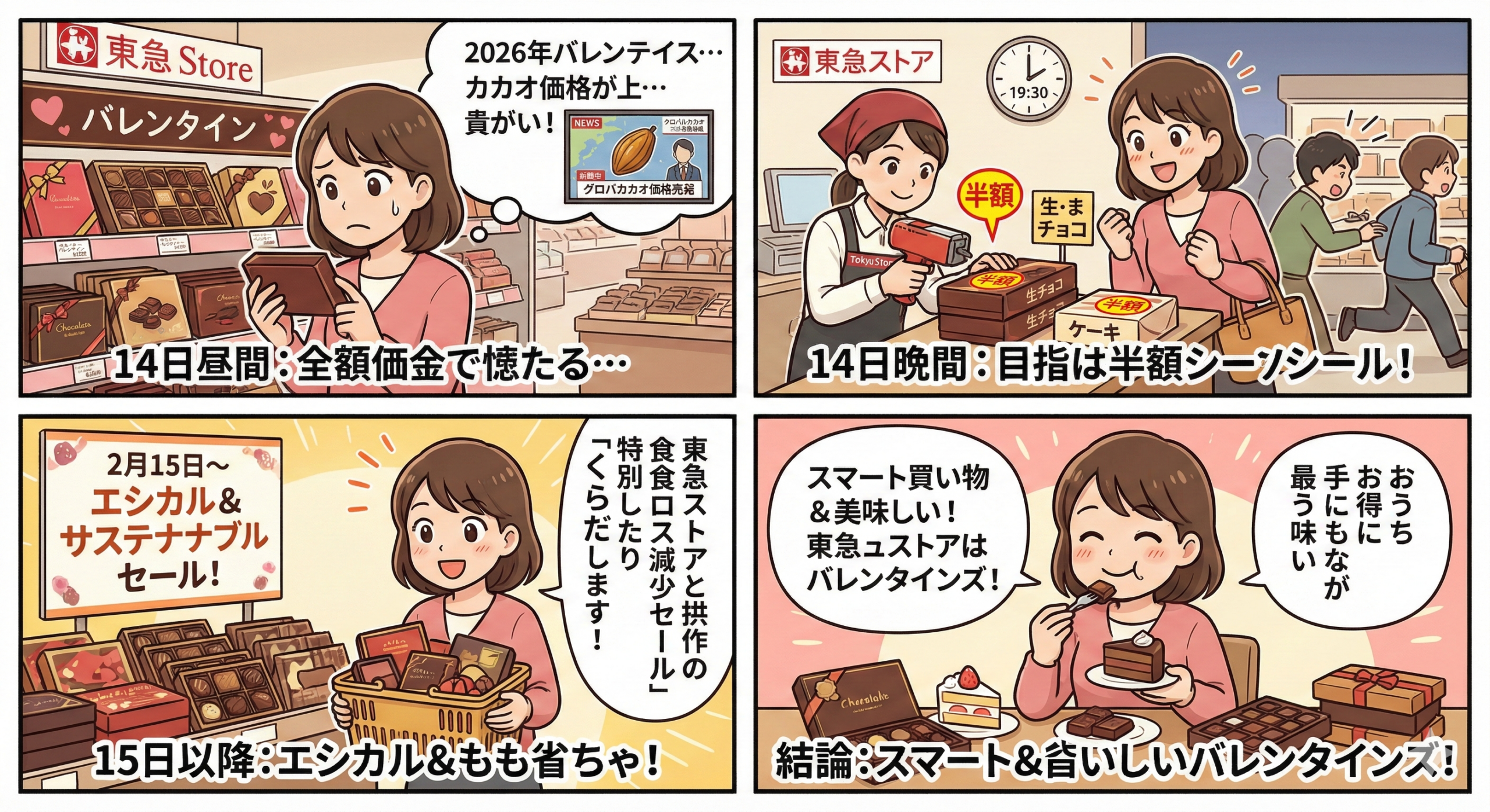 バレンタイン当日の夜に目当ての商品が手に入らなくても、がっかりしないでください。2026年の東急ストアと東急グループは、2月15日以降を「第二の商戦」として位置づけています。廃棄を減らし、価値を再分配するサステナブルな取り組みが、私たち消費者にとっても大きなメリットとなっているのです。